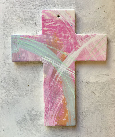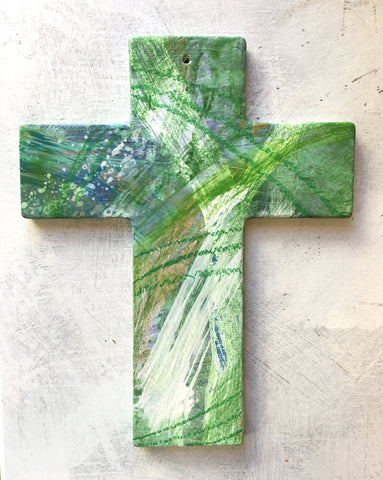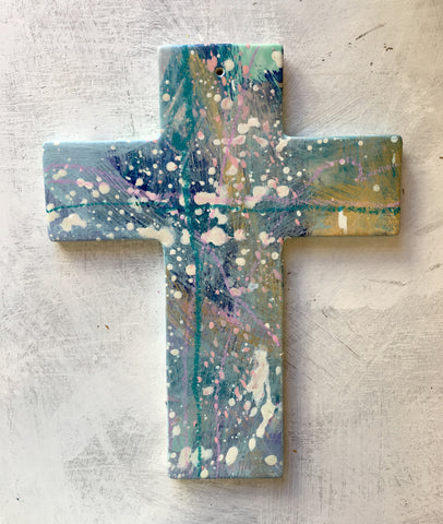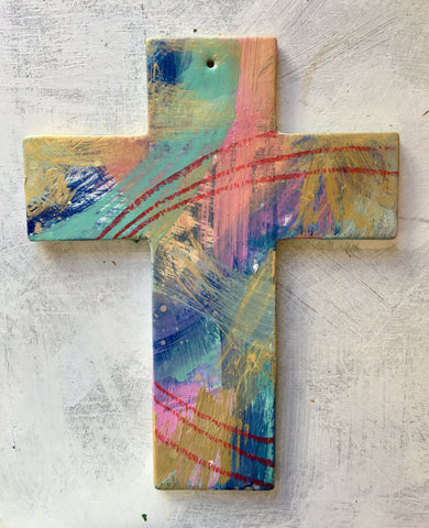This mixed media series of ceramic crosses measures 8 x 10 inches. Acrylic paint, graphite, oil pastel, gold and silver leafing, and metallic paints were used on the crosses so that each one is unique.